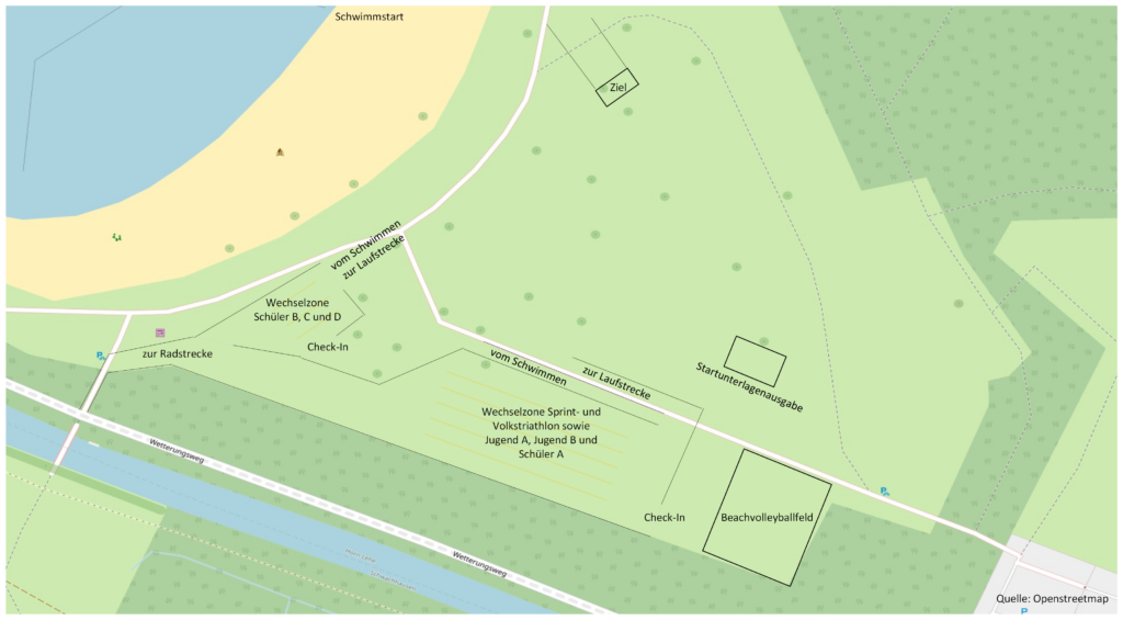 Das Schwimmen beginnt als Wasserstart im Strandbereich (s. obigen Plan für die Erwachsenen). Gelaufen wird als Rundkurs um den See oder Wendepunktstrecke am Seeufer. Der Zieleinlauf entspricht dem des Volks-/Sprinttriathlons.